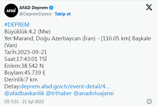 AFAD'dan yapılan açıklamaya göre; Van'ın Başkale ilçesinde 4, 2 büyüklüğünde deprem meydana geldi.