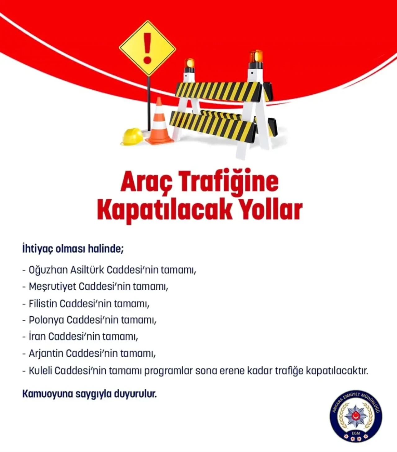 Ankara Emniyet Müdürlüğü, yılbaşı kutlamaları nedeniyle kentte bazı yolların trafiğe kapatılacağını duyurdu. Yapılan açıklamaya göre, 31 Aralık günü saat 18.00’den itibaren belirli güzergâhlarda araç geçişine izin verilmeyecek. Kapatma uygulaması, programlar sona erene kadar devam edecek.