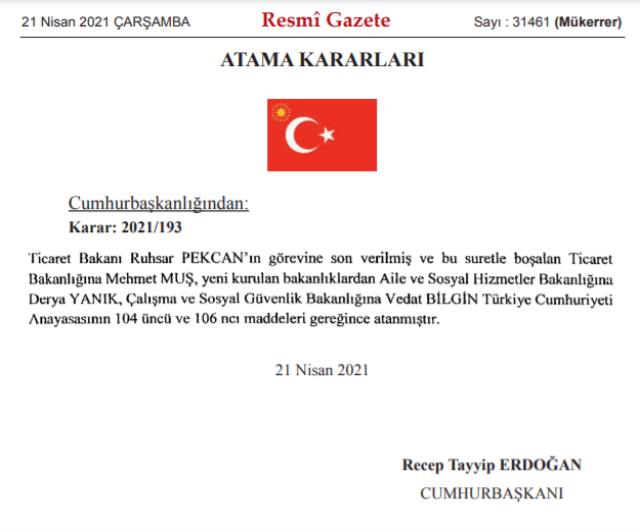 Bugünkü Resmi Gazete'de yayımlanan karara göre; Aile, Çalışma ve Sosyal Hizmetler Bakanlığı ikiye bölünerek Aile ve Sosyal Hizmetler Bakanlığı ile Çalışma ve Sosyal Güvenlik Bakanlığı kuruldu. Bu gelişmenin ardından bugünkü Resmi Gazete'nin mükerrer sayısında yayımlanan karara göre; Aile ve Sosyal Hizmetler Bakanlığı görevine Derya Yanık, Çalışma ve Sosyal Hizmetler Bakanlığı'na Vedat Bilgin, Ticaret Bakanlığı'na Mehmet Muş atandı.