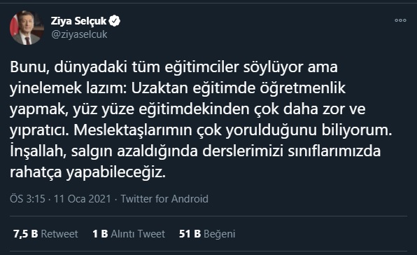 Ziya Selçuk, Twitter hesabından yaptığı açıklamada "Uzaktan eğitimde öğretmenlik yapmak, yüz yüze eğitimdekinden çok daha zor ve yıpratıcı." dedi. Selçuk'un sosyal medya hesabından yaptığı paylaşım şöyle:
