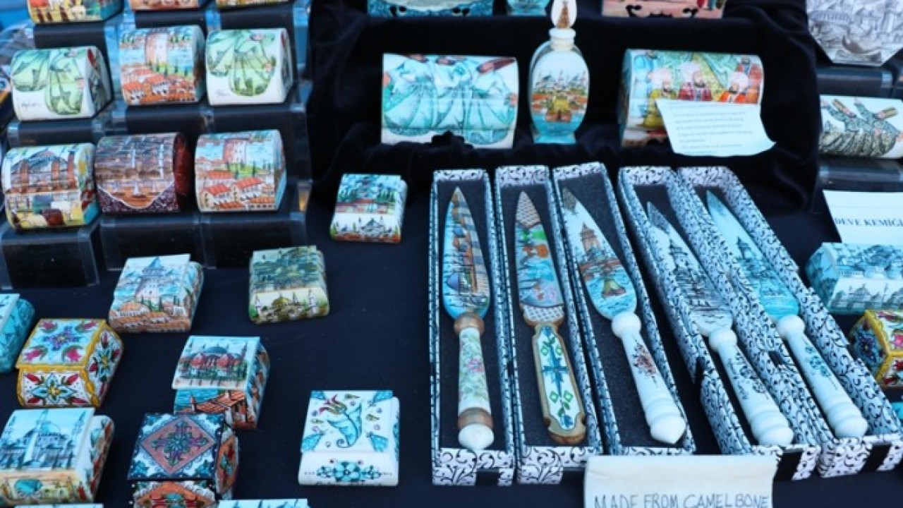 Saraçlar Caddesi'ndeki stantlarda, ustalar el emeği ürünlerini sergiliyor. Bunlar arasında gravür, minyatür, hat ustası Ayhan Kabaoğlu'nun deve kemiği işleyip, sanat eserine dönüştürdüğü ürünler de yer alıyor.