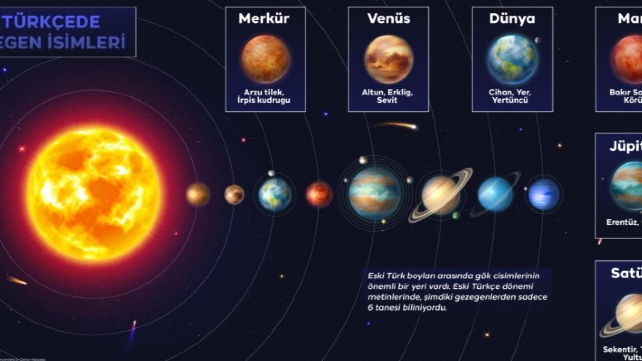 Eski Türk boyları arasında gök cisimlerinin önemli bir yeri vardı. Eski Türkçe (Köktürkçe-Uygurca-Karahanlı Türkçesi) dönemi metinlerinde, şimdiki gezegenlerden sadece 6 tanesi biliniyordu ve bunların hepsinin Türkçe adı vardı. trthaber’in haberine göre, Kırşehir Ahi Evran Üniversitesi'nden Dr. Osman Kabadayı, o isimleri anlattı.
