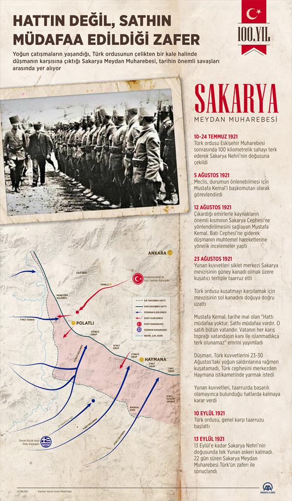 ANKARA (AA) - Sakarya Meydan Muharebesi'nin 100'üncü yılı, zaferin kazanıldığı Polatlı ve Haymana'da çeşitli etkinliklere kutlanacak.