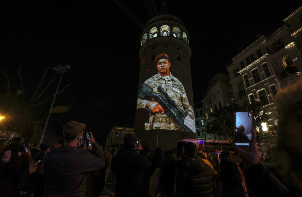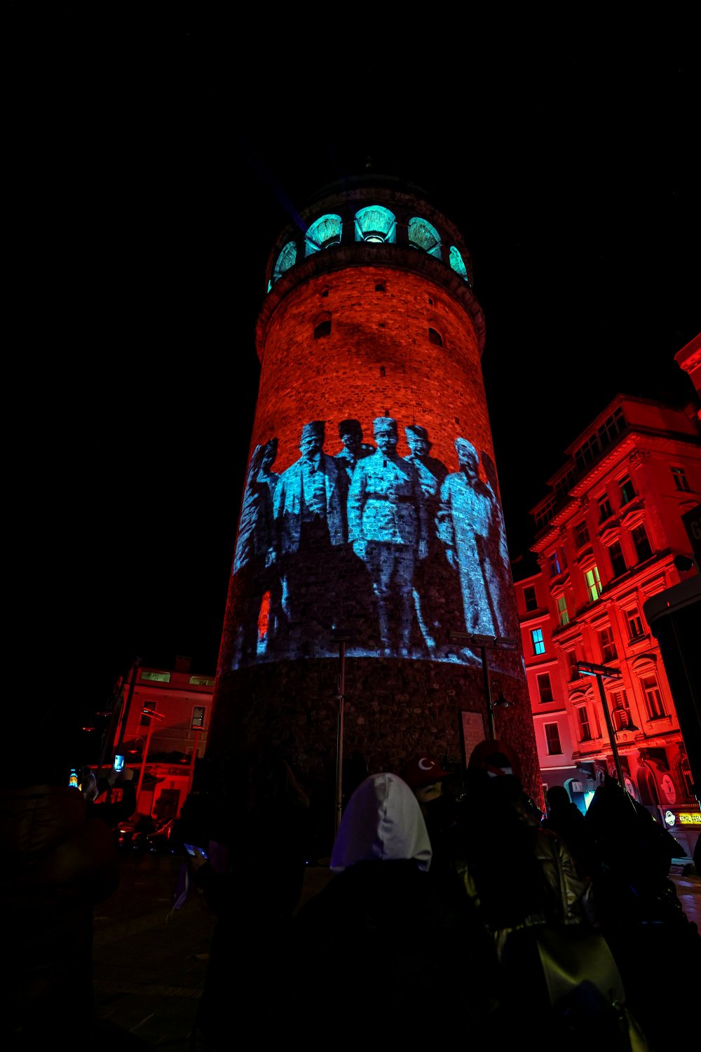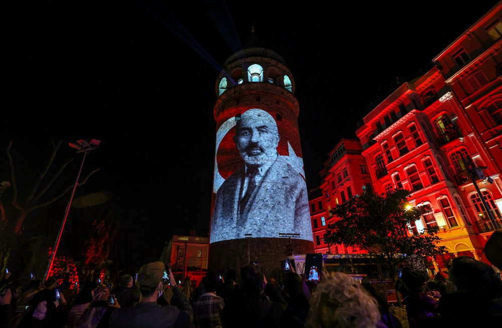 Türklerin Orta Asya'dan çıkışından bugüne kadar geçen dönemde tarihe adlarını yazdırmış önemli isimlere yer verilen gösteride, mapping show yöntemiyle kuleye görüntiler yansıtıldı.