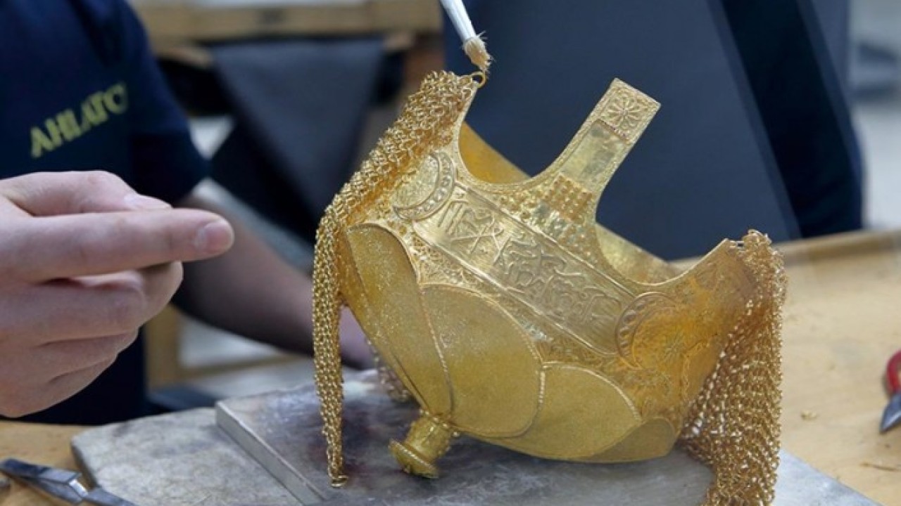 Sultan Alparslan'ın Malazgirt Zaferi'ni temsil eden resimlerden ilham alınarak üretilen altın miğfer, ince işçiliğiyle dikkat çekiyor.