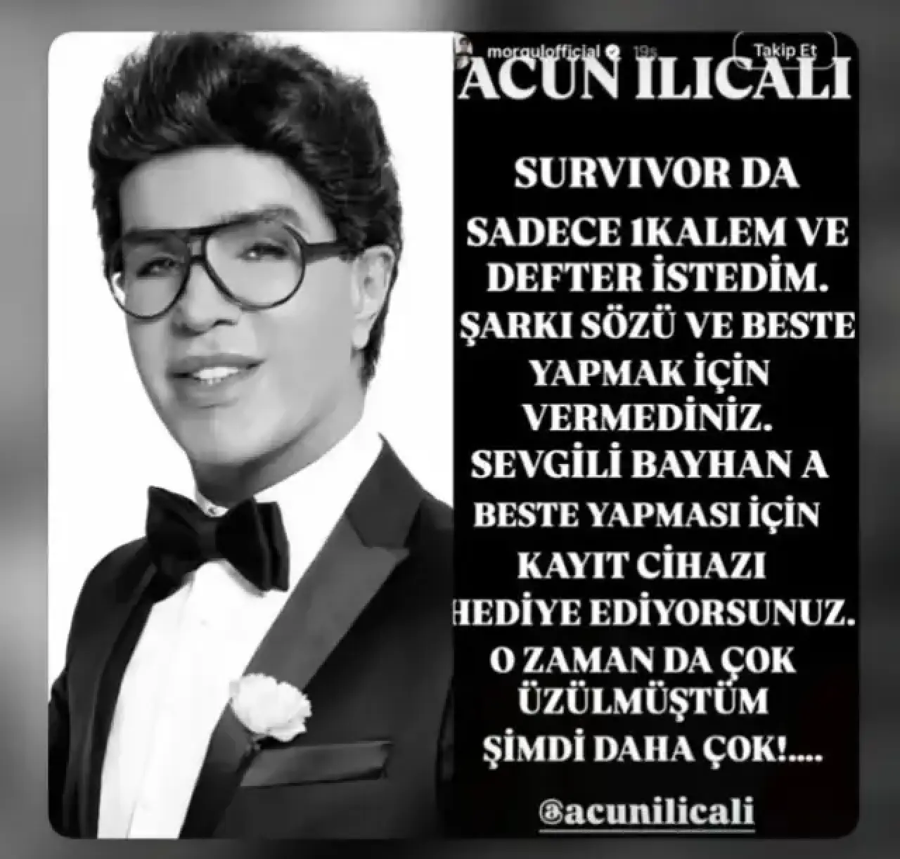 Yılmaz Morgül, Survivor’da yarıştığı döneme ilişkin yaptığı paylaşımda dikkat çekici bir detaya değindi. Morgül, yarışma sırasında beste ve şarkı sözü yazabilmek için yalnızca bir kalem ve defter talep ettiğini, ancak bu isteğinin karşılanmadığını söyledi.