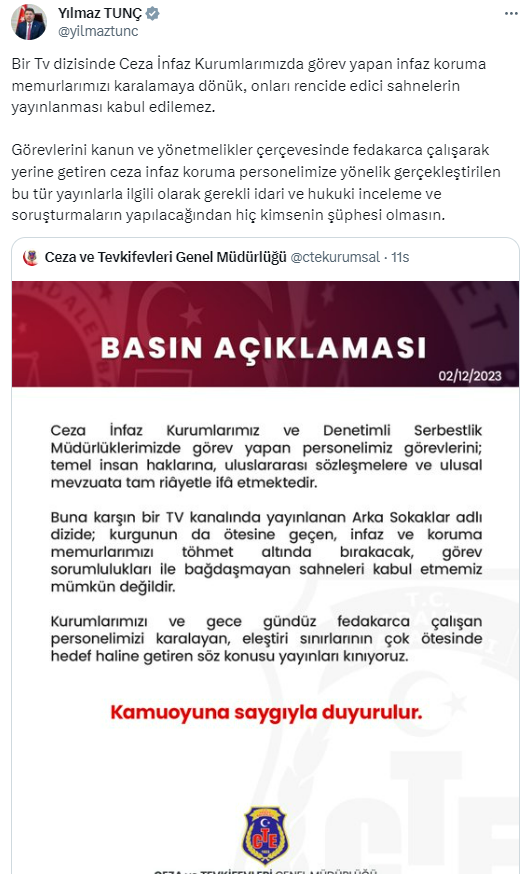 "Bir televizyon dizisinde ceza infaz kurumlarımızda görev yapan infaz koruma memurlarımızı karalamaya dönük, onları rencide edici sahnelerin yayınlanması kabul edilemez.