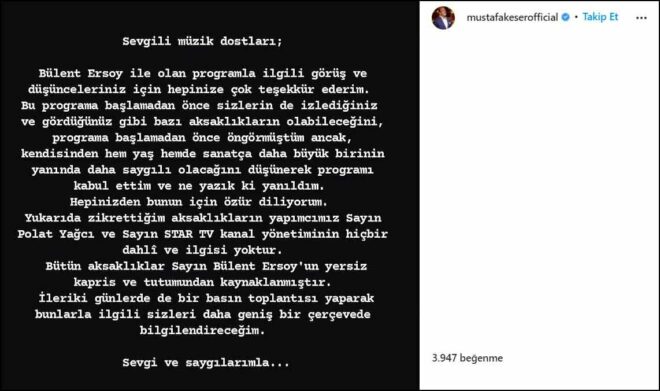 Mustafa Keser, alınan karardan sonra sosyal medya hesabından Bülent Ersoy'a sitem dolu bir mesaj yolladı.