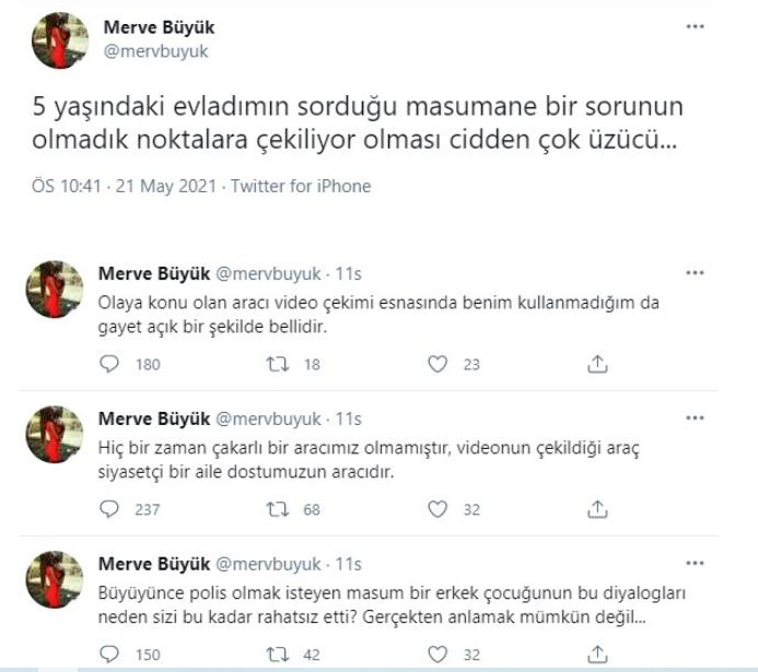 Merve Büyük'ün görüntülerde sirene basa basa ilerleyen araçtaki çocuğunun "Anne biz polis miyiz?" sorusuna "Evet" diye yanıt verdiği duyuldu. O anları sosyal medya hesabından paylaşan Büyük, gelen tepkilerin ardından videoyu silmişti.