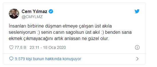 Tepkiler üzerine Cem Yılmaz, sosyal medyadan yaptığı açıklamada "İnsanları birbirine düşman etmeye çalışan üst akıla sesleniyorum. Senin canın sağ olsun üst akıl. Benden sana ekmek çıkmayacağını artık anlasan ne güzel olur" ifadelerini kullandı.