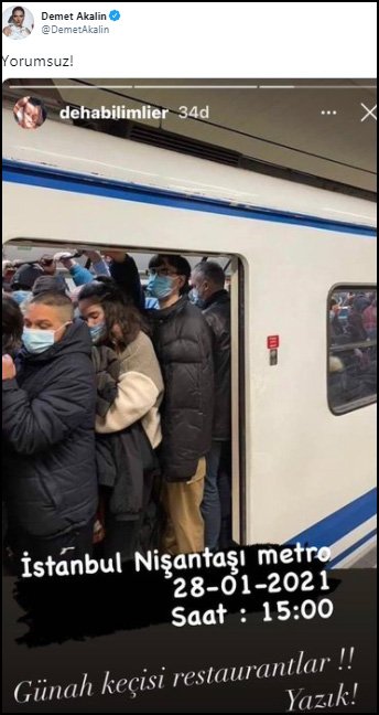 Akalın, Twitter hesabından yaptığı paylaşımda “Günah keçisi restaurantlar! Yazık!” notuyla kabalık bir metro fotoğrafı paylaştı. Akalın’ın arkadaşı Deha Bilimlier’in sayfasından alıntıladığı görüntünün İstanbul Nişantaşı metrosunda çekildiği yazıyordu.