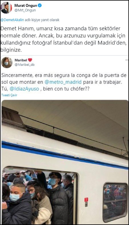 İstanbul Büyükşehir Belediyesi Sözcüsü Murat Ongun Akalın’ın yaptığı bu paylaşıma yanıt verdi. Ongun, “Demet Hanım, umarız kısa zamanda tüm sektörler normale döner. Ancak, bu arzunuzu vurgulamak için kullandığınız fotoğraf İstanbul’dan değil Madrid’den, bilginize” ifadelerini kullandı.