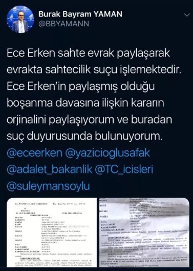 Ancak sunucu Ece Erken'in paylaştığı dilekçenin gerçek olmadığı ortaya çıktı. Avukat Burak Bayram Yaman, paylaşılan belgenin sahte olduğunu ifade etti ve orjinal belgeyi paylaştı.