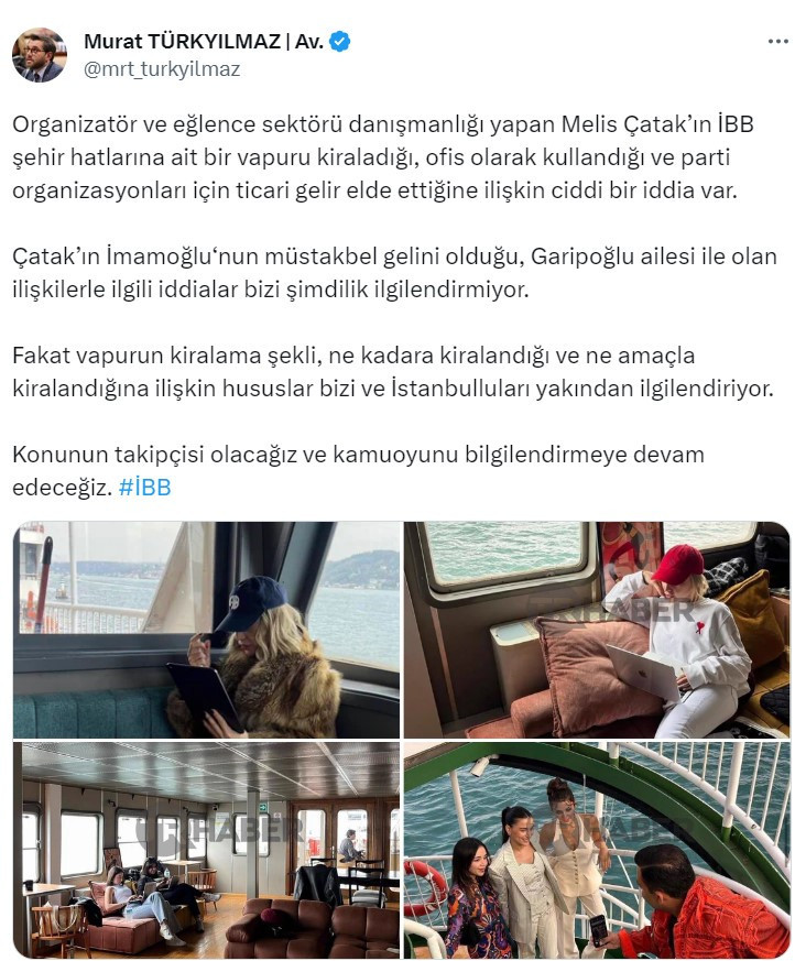 "Organizatör ve eğlence sektörü danışmanlığı yapan Melis Çatak'ın İBB şehir hatlarına ait bir vapuru kiraladığı, ofis olarak kullandığı ve parti organizasyonları için ticari gelir elde ettiğine ilişkin ciddi bir iddia var. Çatak'ın İmamoğlu'nun müstakbel gelini olduğu, Garipoğlu ailesi ile olan ilişkilerle ilgili iddialar bizi şimdilik ilgilendirmiyor. Fakat vapurun kiralama şekli, ne kadara kiralandığı ve ne amaçla kiralandığına ilişkin hususlar bizi ve İstanbulluları yakından ilgilendiriyor. Konunun takipçisi olacağız ve kamuoyunu bilgilendirmeye devam edeceğiz."