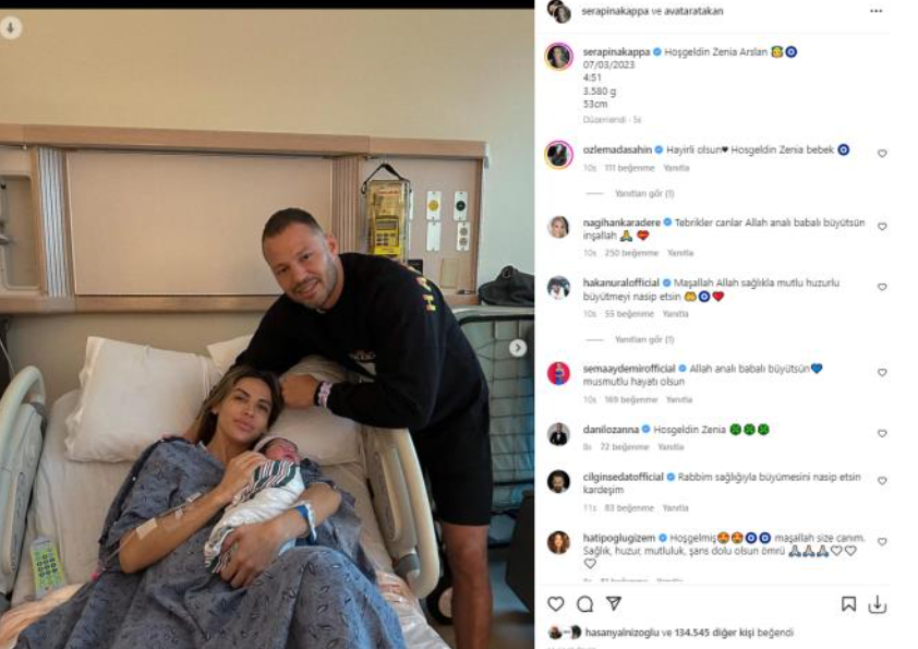 Çiftin "Zenia" adını verdikleri kızları salı günü özel bir hastanede dünyaya geldi. 1, 2 milyon takipçisinin bulunduğu Instagram hesabından eşi ve kızıyla verdiği pozları yayınlayan Arslan, "Hoş geldin Zenia Arslan. 07.03.2023. 04.51, 3, 580 gram, 53 cm" notunu yazdı.