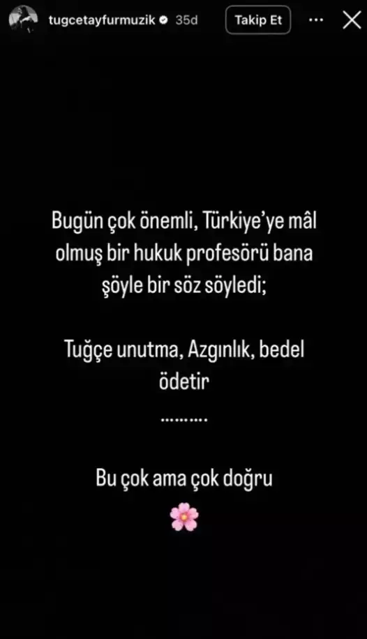 Babasının vasiyetinde adının geçmemesi üzerine kızı Tuğçe Tayfur, sosyal medya hesabından dikkat çeken bir paylaşım yaptı. “Bugün çok önemli, Türkiye'ye mâl olmuş bir hukuk profesörü bana şöyle bir söz söyledi; Tuğçe unutma, azgınlık bedel ödetir. Bu çok ama çok doğru...” ifadelerini kullandı.