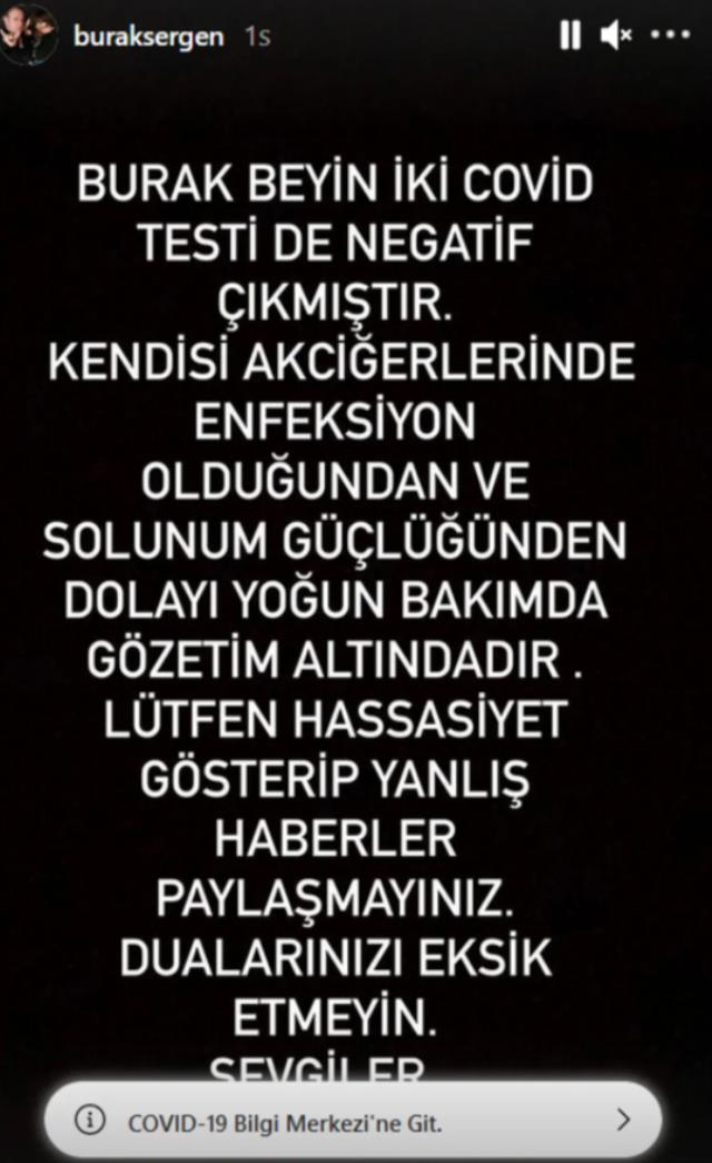 Sergen'in sosyal medya hesabından yapılan paylaşımda 2 kovid-19 testi sonucunun da negatif çıktığı söylenmiş ve sevenlerinden dua istenmişti. Usta oyuncunun nişanlısı Nihan Ünsal ise dün yaptığı paylaşımda "Kendisinin durumunda bir değişiklik yok, stabil. Yeniden yapılan koronavirüs testleri negatif çıktı. Tedavisi yoğun bakımda devam ediyor" ifadelerini kullanmıştı.