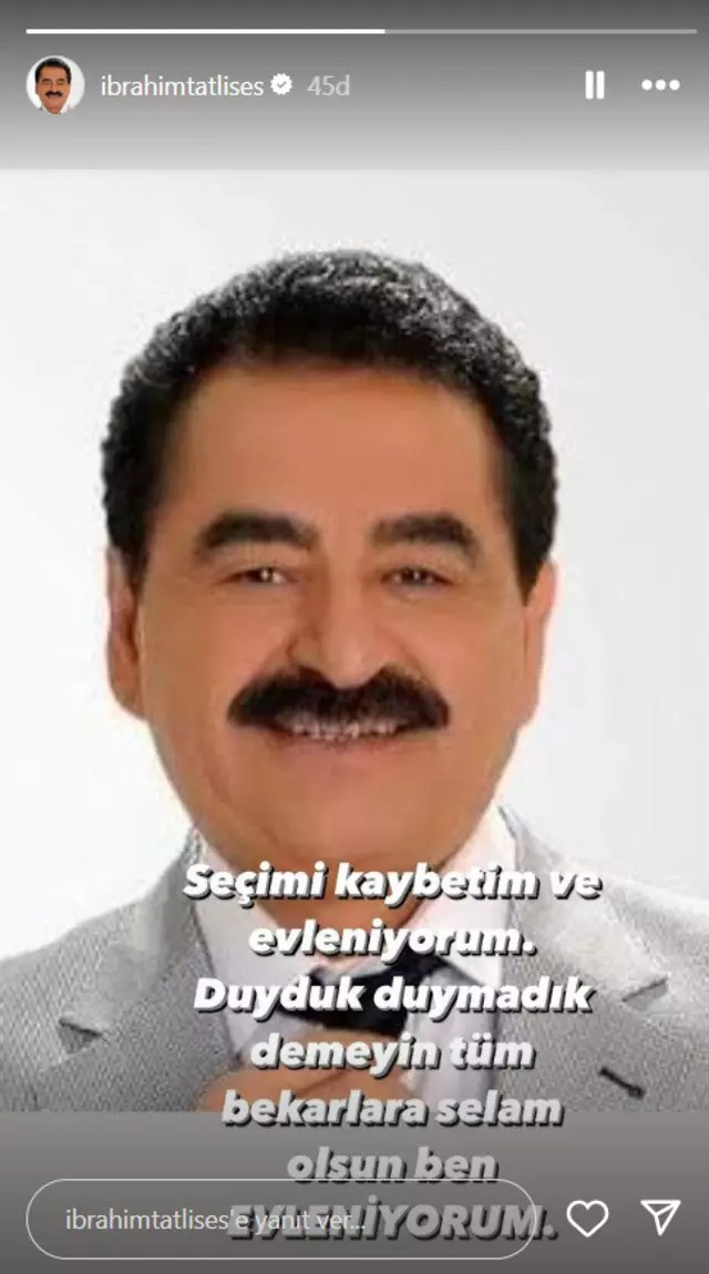 "Seçimi kaybettim ve evleniyorum. Duyduk duymadık demeyin tüm bekarlara selam olsun. Ben evleniyorum."