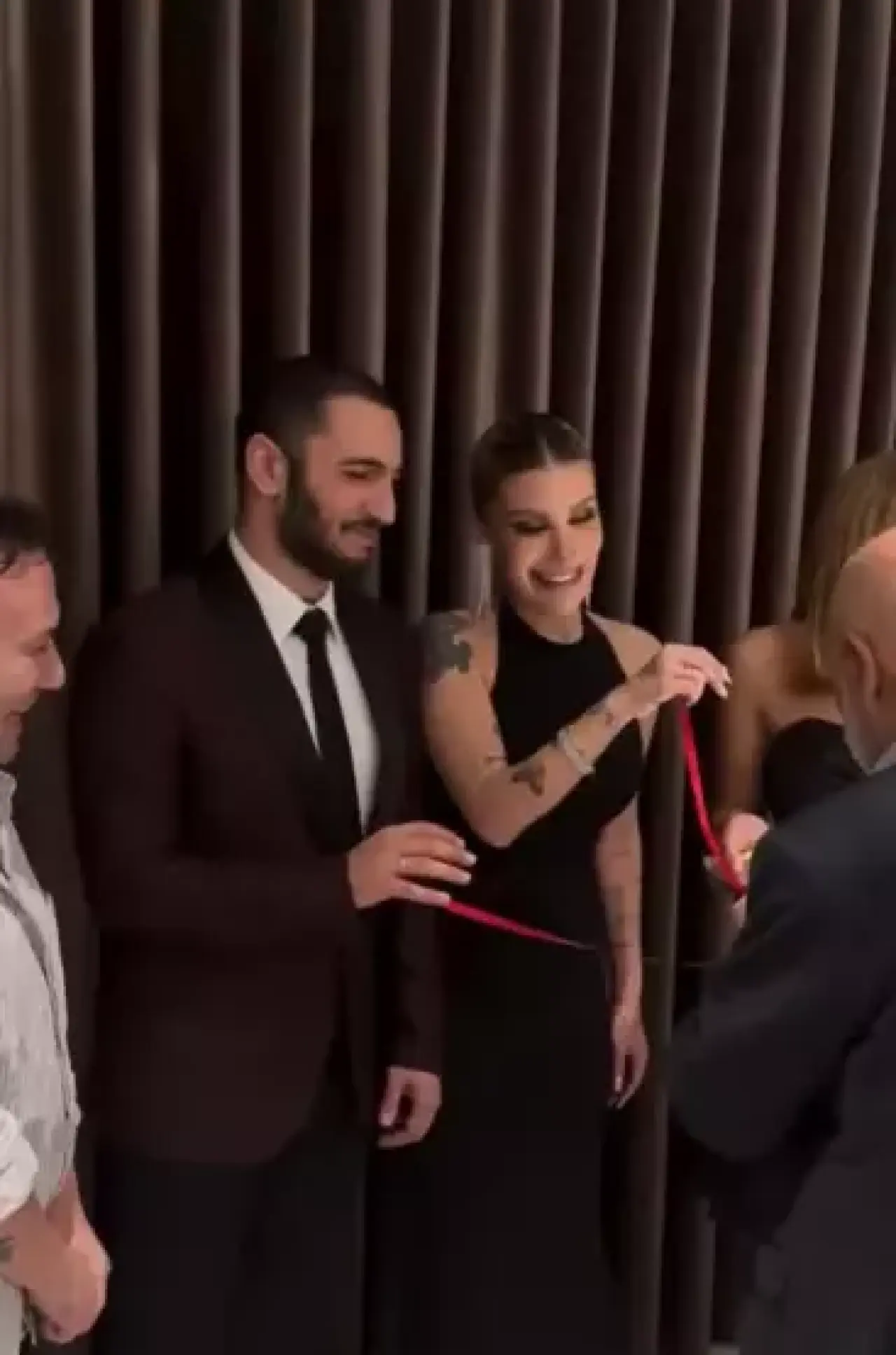 Gecenin en dikkat çeken anlarından biri yüzük takma töreni oldu. Çiftin nişan yüzüklerini İrem Derici’nin menajeri Özgür Aras takarken, kurdeleyi Melih Kunukcu’nun dedesi Hayrullah Akşahin kesti.