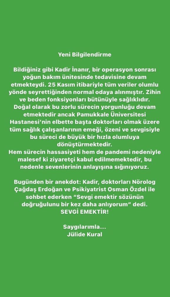 Muğla'nın Ortaca ilçesinde cumartesi günü rahatsızlanan ve ambulansla Denizli Pamukkale Üniversitesi Hastanesi'ne kaldırılarak tedavi altına alınan Kadir İnanır'la ilgili hayat arkadaşı Julide Kural bir açıklama yaptı.