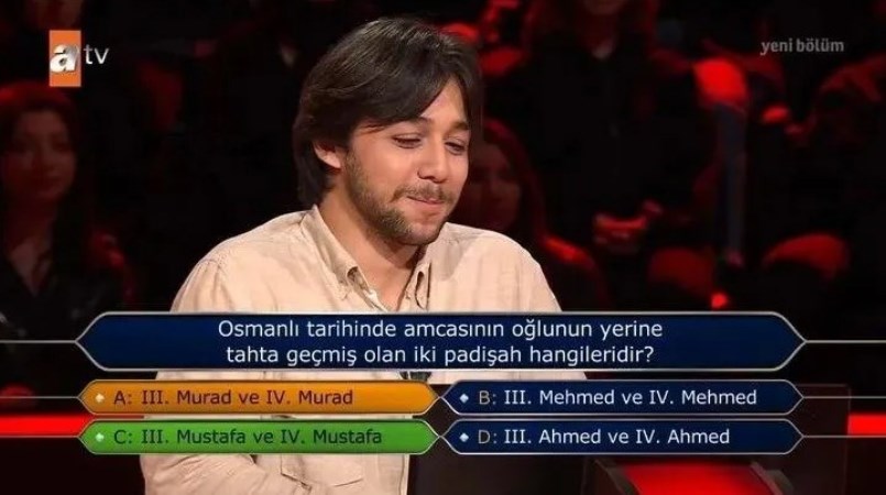 Programda Aybatur Kıvanç isimli yarışmacıya, "Osmanlı tarihinde amcasının oğlunun yerine tahta geçmiş olan iki padişah hangileridir?" sorusu yöneltildi. Şıklar da şu şekilde çıktı: