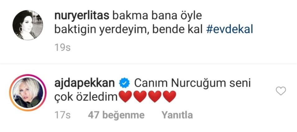 Ünlü modacı Nur Yerlitaş’ın 19 saat önce Instagram hesabından yaptığı paylaşım ortaya çıktı. Yerlitaş, o paylaşımında, “Bakma bana öyle, baktığın yerdeyim. Bende kal” diye yazdı. Yerlitaş’a cevap veren Ajda Pekkan ise, “Canım Nurcuğum, seni çok özledim” ifadelerini kullandı.