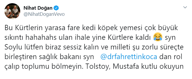 Doğan, "Bu Kürtlerin yarasa fare kedi köpek yemesi çok büyük sıkıntı. İhale yine Kürtlere kaldı. Sayın Soylu lütfen biraz sessiz kalın ve milleti şu zorlu süreçte birleştiren Sağlık Bakanı Fahrettin Koca'dan rol çalıp toplumu bölmeyin. Tolstoy, Mustafa kutlu okuyun" yanıtını verdi.