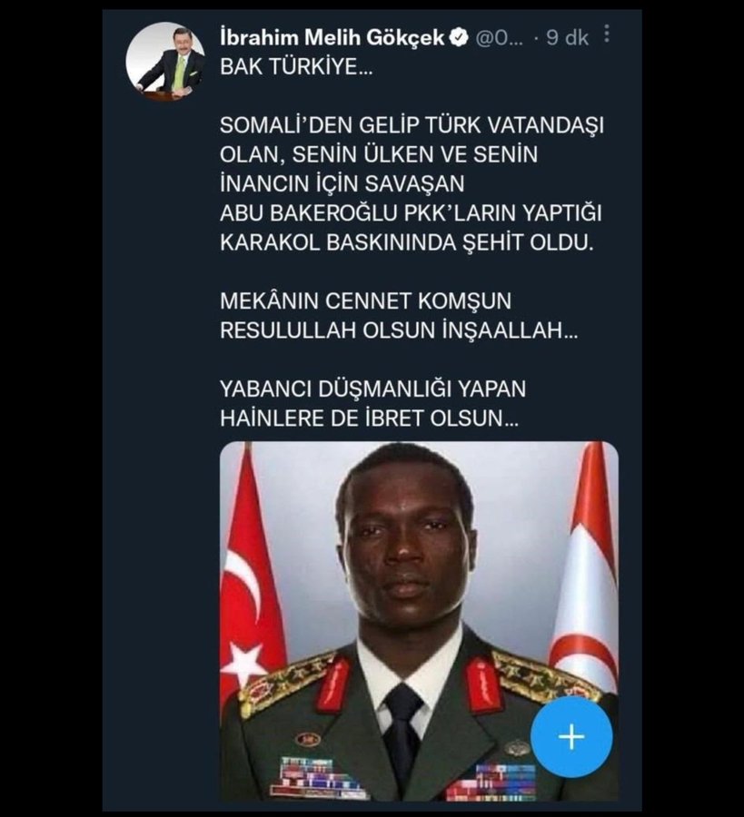 Beşiktaş'ın eski futbolcusu Vincent Aboubakar'a yapılan orgeneral üniformalı montajı gerçek sanarak sosyal medya hesabından paylaşan Ankara Büyükşehir Belediyesi eski Başkanı Melih Gökçek, 'Somali'den gelip Türk vatandaşı olan Abu Bakeroğlu şehit oldu' demişti.