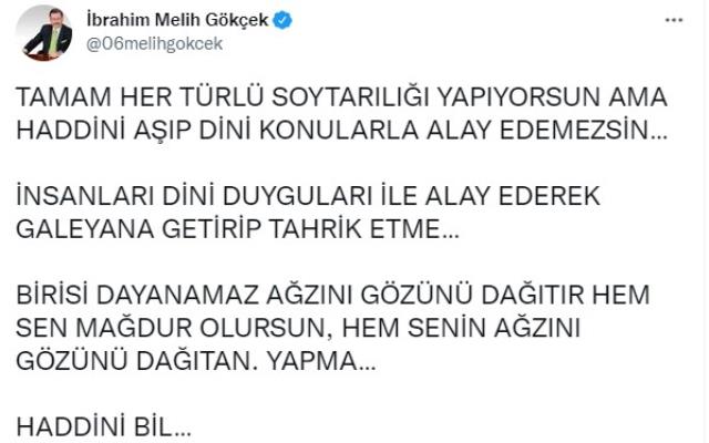 Gökbakar'ın bu sözlerine en sert tepki ise Eski Ankara Büyükşehir Belediye Başkanı Melih Gökçek'ten geldi. Gökçek, paylaşımında şunları söyledi: "Tamam her türlü soytarılığı yapıyorsun ama haddini aşıp dini konularla alay edemezsin. İnsanları dini duyguları ile alay ederek galeyana getirip tahrik etme. Birisi dayanamaz ağzını gözünü dağıtır hem sen mağdur olursun hem karşı taraf. Haddini bil"