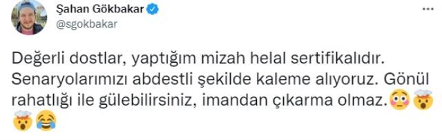 Ünlü komedyen Şahan Gökbakar ise hem bu konuyu hem de İçişleri Bakanı Süleyman Soylu'nun "Benim sizden isteyeceğim bir tek şey var. Mesleğinizin hakkını verin. Görevinize çıkarken, Allah rızası için abdestli çıkın, Ayet-el Kürsilerle çıkın. Biliniz ki, Cenab-ı Allah sizin muhafızınızdır." sözlerini tiye alıp sosyal medya hesabından, "Değerli dostlar, yaptığım mizah helal sertifikalıdır. Senaryolarımızı abdestli şekilde kaleme alıyoruz. Gönül rahatlığı ile gülebilirsiniz, imandan çıkarma olmaz." ifadelerini kullandı.