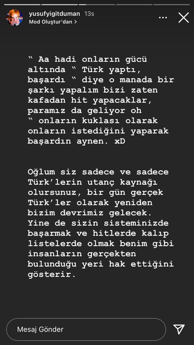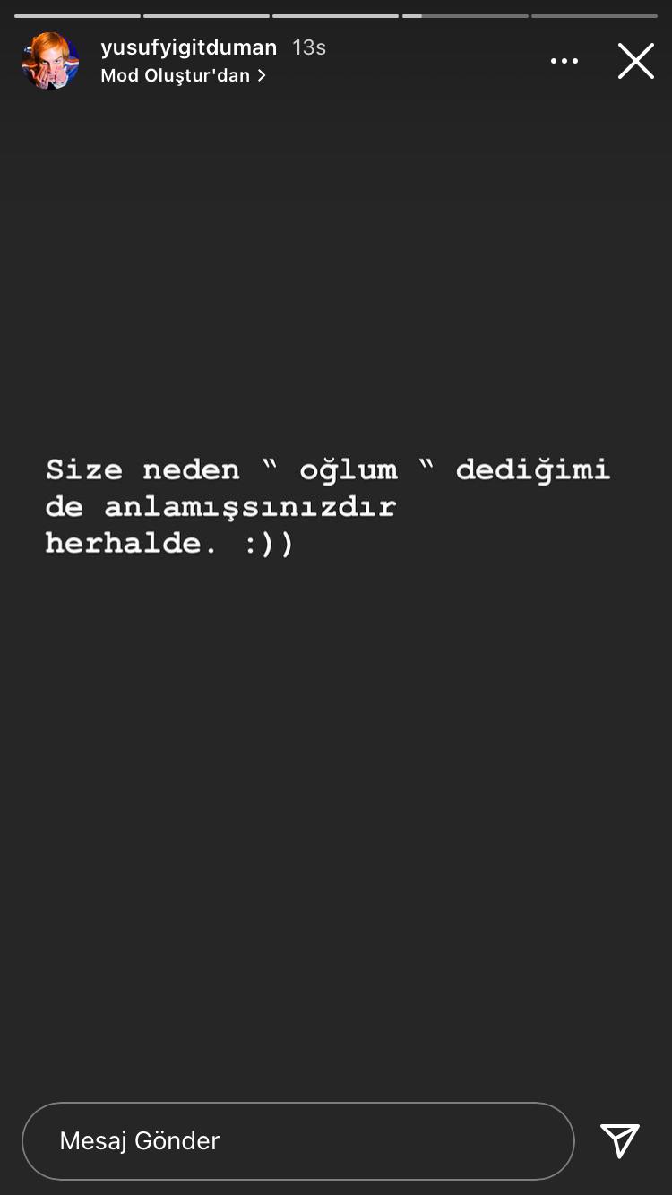 Son dönemde Instagram'dan yaptığı açıklamalarıyla gündem olan ve dünya çapında büyük ilgi ve beğeni toplayan ünlü şarkıcı Yusuf Yiğit Duman, yine dün gece geç saatlerde Instagram hesabından 2 adet kafaların karışmasına neden olan story attı. Storylerinde görüntülerde yazdığı üzere şu sözleri kullandı;