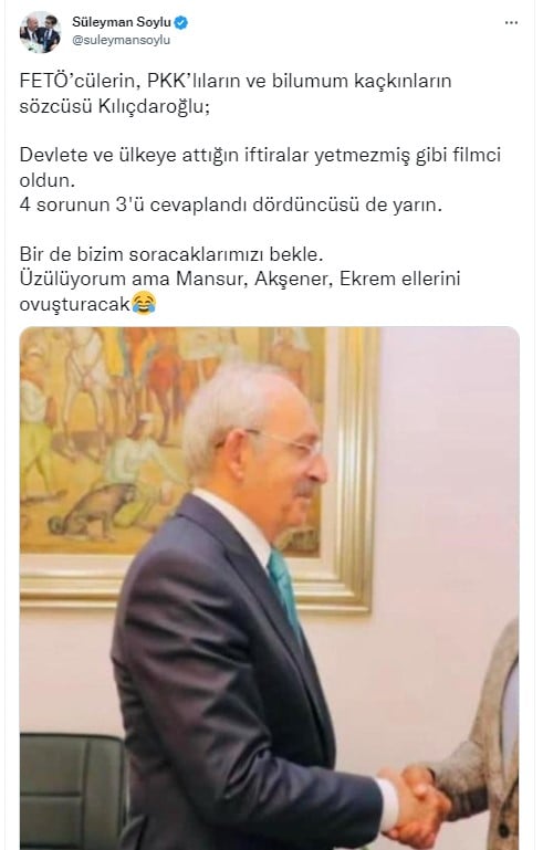 Paylaşımında Kılıçdaroğlu'nun bir kişiyle tokalaştığı fotoğrafa yer veren Bakan Soylu, "FETÖ’cülerin, PKK’lıların ve bilumum kaçkınların sözcüsü Kılıçdaroğlu; Devlete ve ülkeye attığın iftiralar yetmezmiş gibi filmci oldun. 4 sorunun 3'ü cevaplandı dördüncüsü de yarın." dedi.
