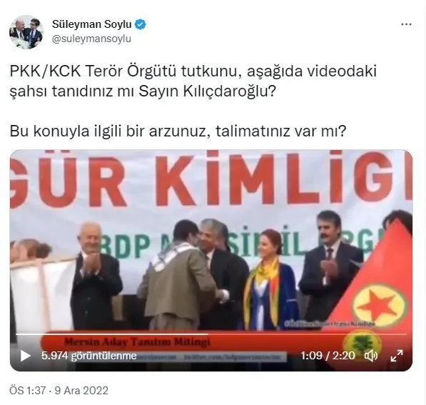 İçişleri Bakanı Süleyman Soylu, sosyal medya hesabından bir video paylaşarak, CHP Genel Başkanı Kemal Kılıçdaroğlu'na "PKK/KCK Terör Örgütü tutkunu, aşağıda videodaki şahsı tanıdınız mı Sayın Kılıçdaroğlu? Bu konuyla ilgili bir arzunuz, talimatınız var mı?" diye sordu.