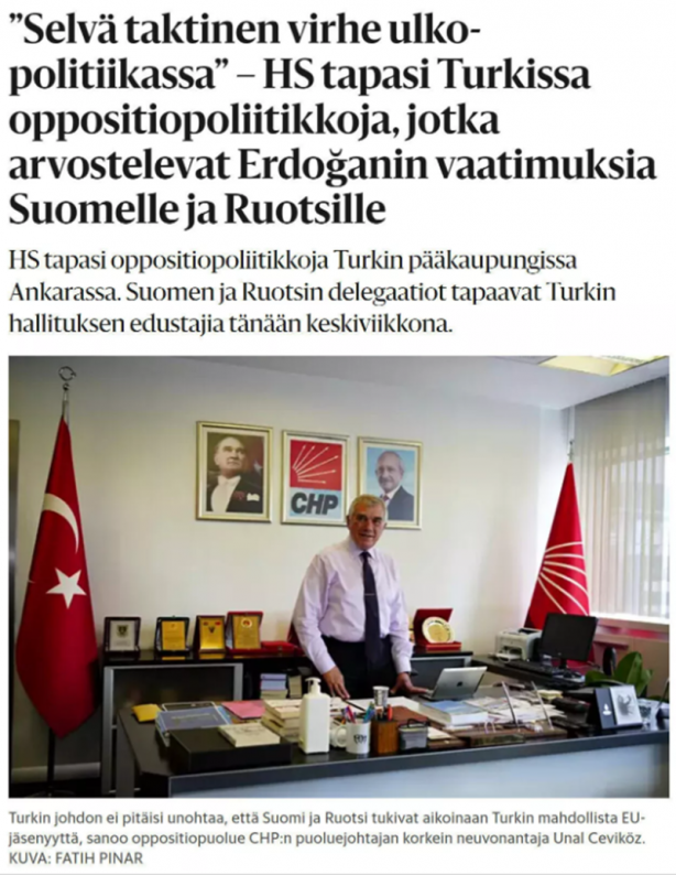 Cumhurbaşkanı Recep Tayyip Erdoğan'ın, Finlandiya'nı terör örgütü PKK/YPG'ye desteği nedeniyle NATO üyeliğine karşı çıkmasını 'taktiksel bir hata' olarak tanımlayan Çeviköz, "CHP, Finlandiya'nın NATO üyeliğini desteklemeye hazır" ifadelerini kullandı.