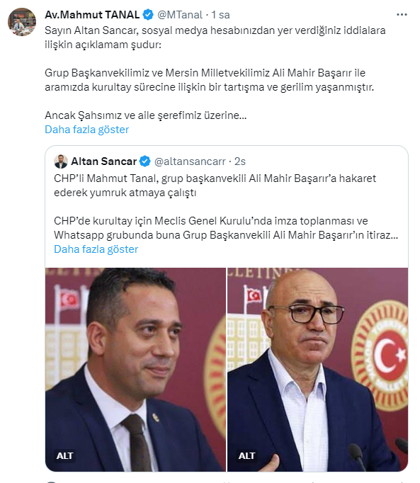 Grup Başkanvekilimiz ve Mersin Milletvekilimiz Ali Mahir Başarır ile aramızda kurultay sürecine ilişkin bir tartışma ve gerilim yaşanmıştır. Ancak Şahsımız ve aile şerefimiz üzerine karşılıklı hakaret kesinlikle olmamıştır. Paylaşımınızda yer alan “Ali Mahir Başarır’ın şahsına ve ailesine yönelik ağır ifadeler kullandığım” iddiası, külliyen yalandır! Ali Mahir Başarır’ın ailesi benim ailemdir, benim ailem de Ali Mahir Başarır’ın ailesidir. Her bir CHP’linin ailesi, benim ailemdir.