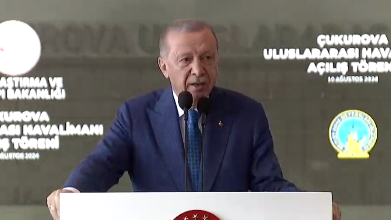 Cumhurbaşkanı Recep Tayyip Erdoğan, Türkiye'nin 58. havalimanı olan Çukurova Uluslararası Havalimanı'nın açılış töreninde açıklamalarda bulunuyor .