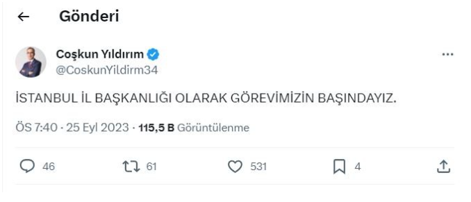 Yıldırım, 25 Eylül'de sosyal medya hesabından yaptığı paylaşımda, "Görevimizin başındayız" ifadelerini kullanmıştı.