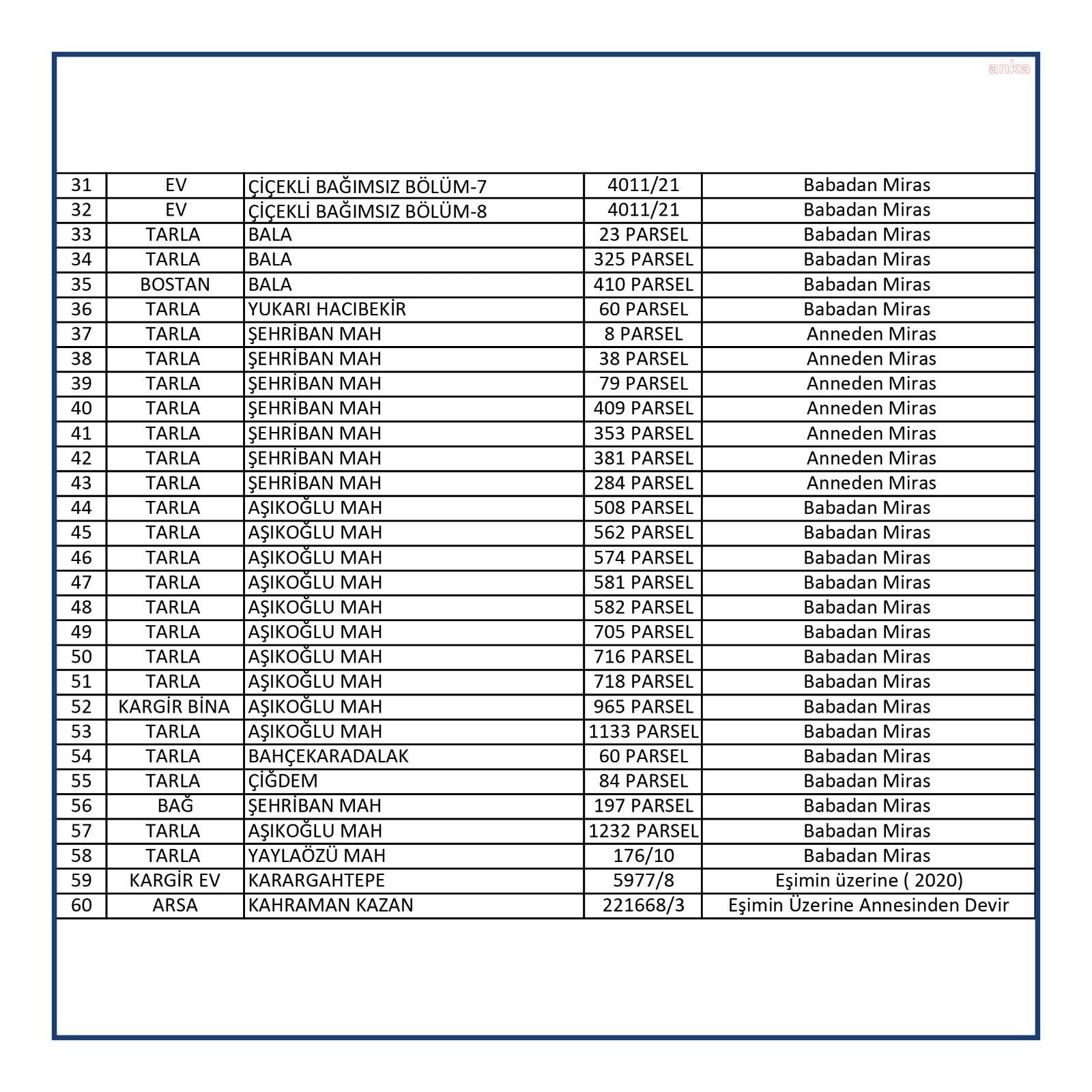 Diğer Hususlar: Anne ve babadan kalan gayrimenkullerde miras olması sebebiyle değişen oranlarda hissem vardır. Etimesgut ilçesinde babamdan miras kalan daireler ve arsalar muhtelif tarihlerde satılmıştır. Anne babadan kalan gayrimenkuller üzerinde parsel değişikliğinden dolayı edinim tarihleri, parsel adetleri ve hisse oranları farklılık gösterebilir."