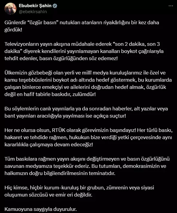 Ülkemizin gözbebeği olan yerli ve millî medya kuruluşlarımız ile özel ve kamu teşebbüslerini boykot adı altında hedef göstermek, bu kurumlarda çalışan binlerce emekçiyi ve ailelerini doğrudan hedef almak, özgürlük değil en hafif tabirle baskıdır, zulümdür.”