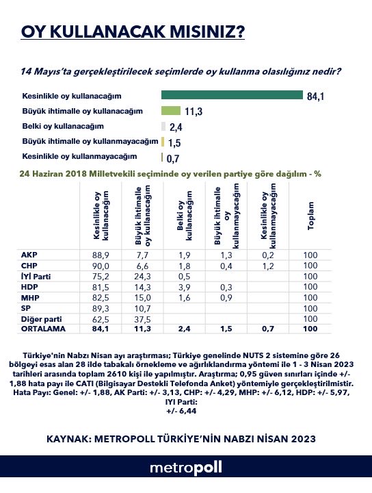 MetroPoll Araştırma Başkanı Özer Sencar'ın paşylaştığı sonuçlara göre; katılımcıların yüzde 84, 1’i bu seçimde 'kesinlikle' oy kullanacağını belirtirken, yüzde 11, 3’ü ‘büyük ihtimalle’ oy kullanacağını söyledi. Bunun da oy kullanma oranı açısından rekor olacağını belirtti.