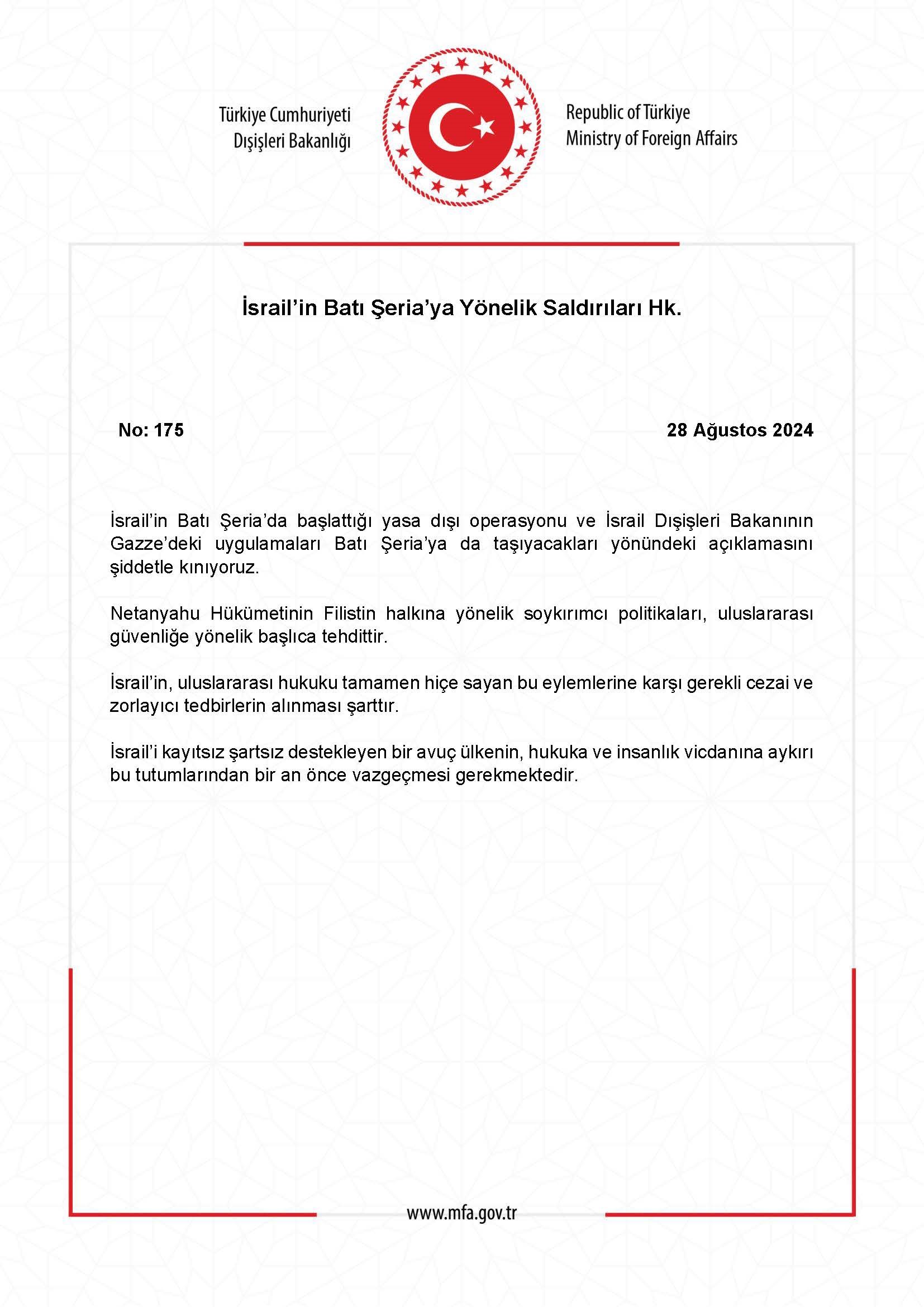 Bakanlık açıklamasında, "İsrail’in Batı Şeria’da başlattığı yasa dışı operasyonu ve Gazze’deki politikaların Batı Şeria'ya taşınacağına dair açıklamaları şiddetle kınıyoruz. Netanyahu Hükümetinin Filistin halkına yönelik soykırımcı politikaları, uluslararası güvenliğe büyük bir tehdittir. İsrail’in uluslararası hukuku hiçe sayan bu eylemlerine karşı gerekli cezai ve zorlayıcı tedbirlerin alınması şarttır" denildi. Ayrıca, "İsrail’i kayıtsız şartsız destekleyen ülkelerin hukuka ve insanlık vicdanına aykırı bu tutumlarından bir an önce vazgeçmesi gerektiği" vurgulandı.