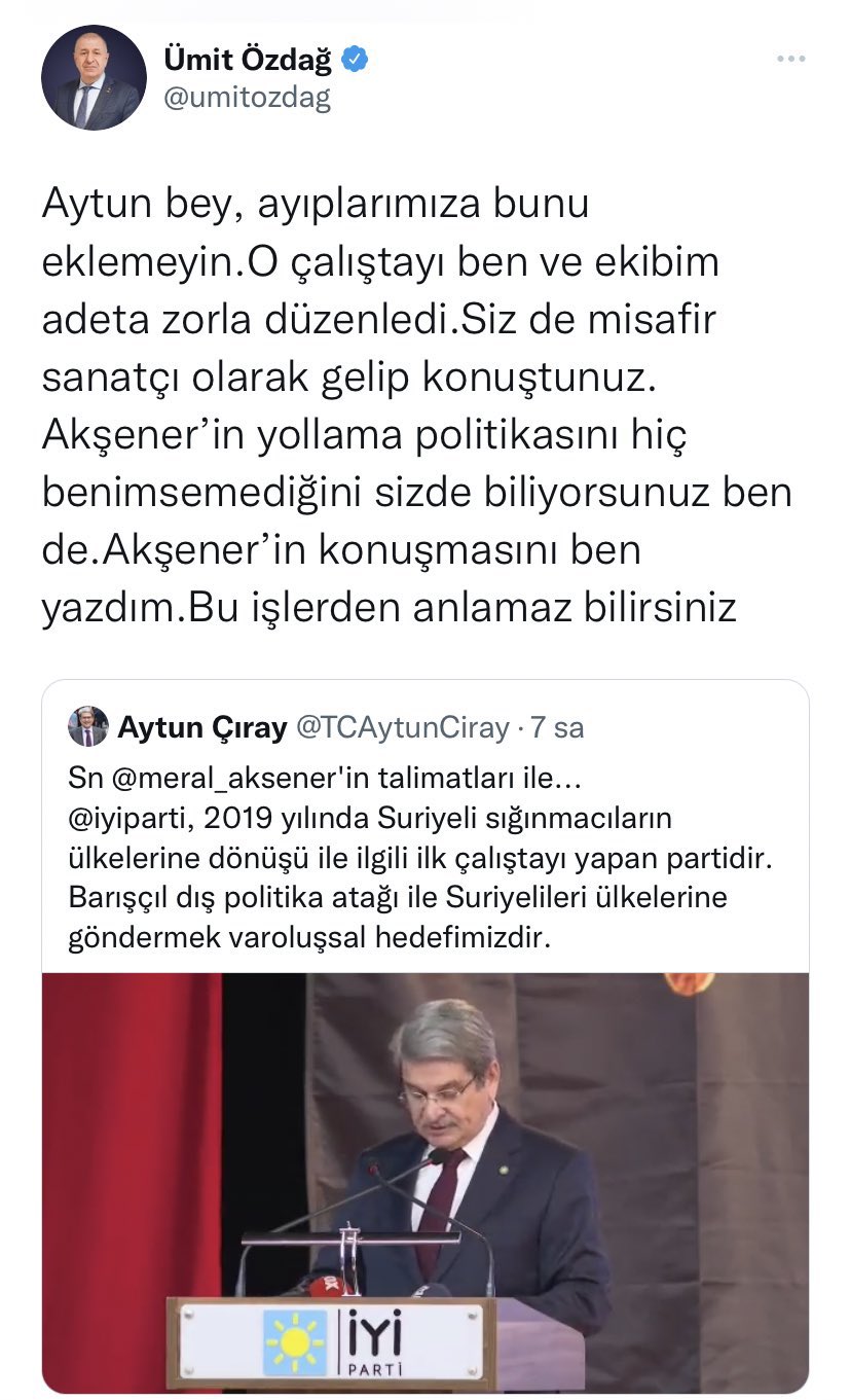 Ümit Özdağ, Aytun Çıray'ın sözünü ettiği çalıştayı kendisinin hazırladığını, Meral Akşener'in aslında Suriyelileri geri göndermi fikrinden hiç hoşlanmadığını, hatta o çalıştayda Akşener'in konuşmasını da kendisinin kaleme aldığını belirtti.