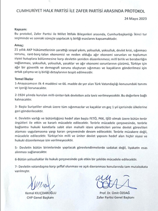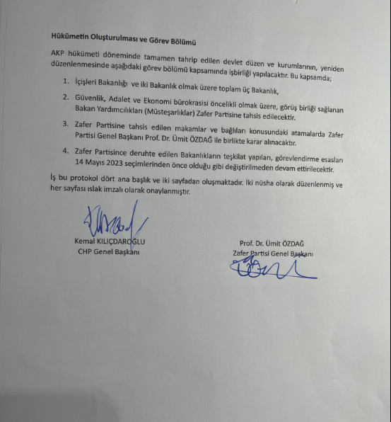 Zafer Partisi Genel Başkanı Ümit Özdağ, X hesabından eski CHP Genel Başkanı Kemal Kılıçdaroğlu’yla 28 Mayıs’taki cumhurbaşkanı seçimi ikinci turu öncesi yaptığı gizli protokolün belgelerini yayımladı.