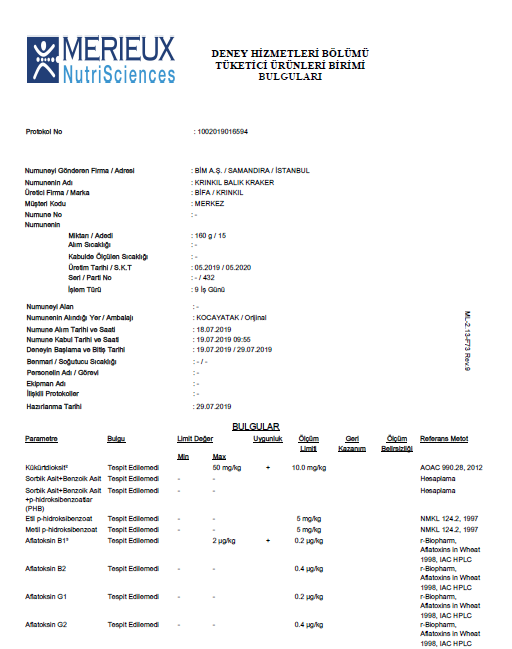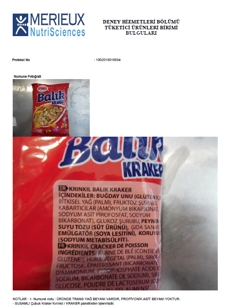 Yetkililer ayrıca Krınkıl balık krakerin analiz raporunu da Ortadoğu Gazetesi'yle paylaşmıştı.