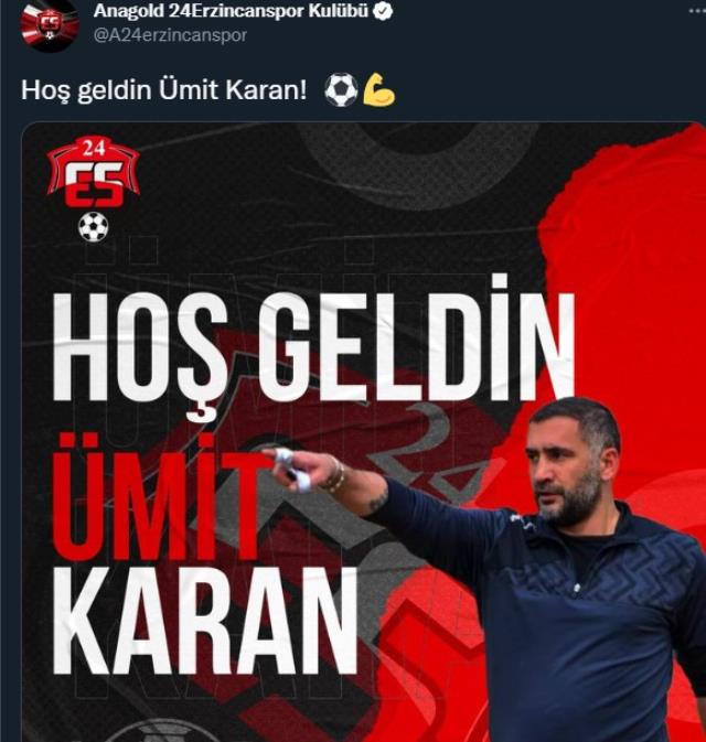 Eski Galatasaraylı futbolcu Ümit Karan, TFF 2. Lig ekiplerinden Uşakspor'da yürüttüğü teknik direktörlük görevinden ayrıldı. Tecrübeli hoca, 1 gün sonra aynı ligde mücadele eden Anagold 24Erzincanspor ile 1+1 yıllık anlaşma sağladı.