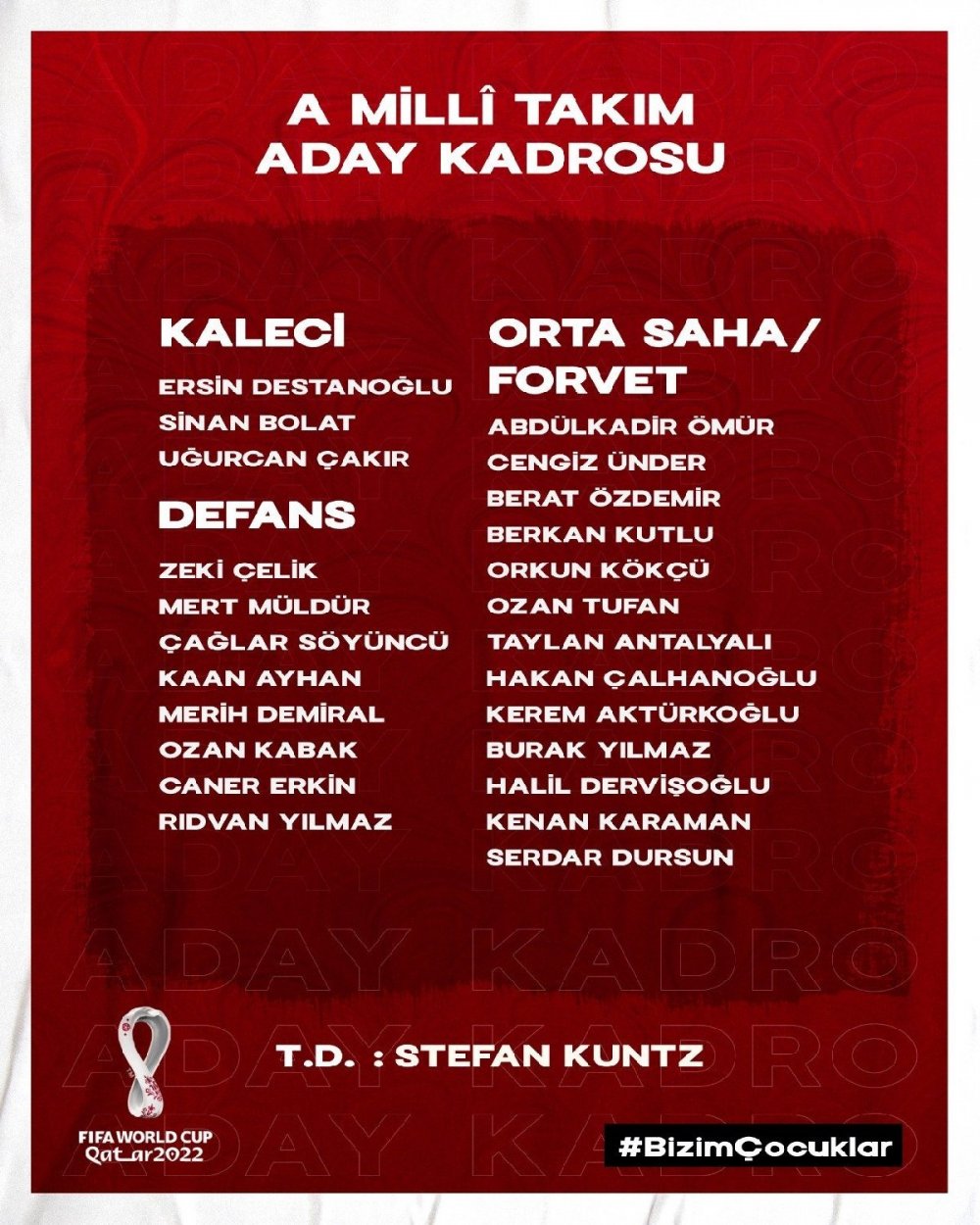 A Millİ Takımımızın 2022 FIFA Dünya Kupası Avrupa Elemeleri’nde Cebelitarık ve Karadağ ile oynayacağı karşılaşmaların aday kadrosu belli oldu.