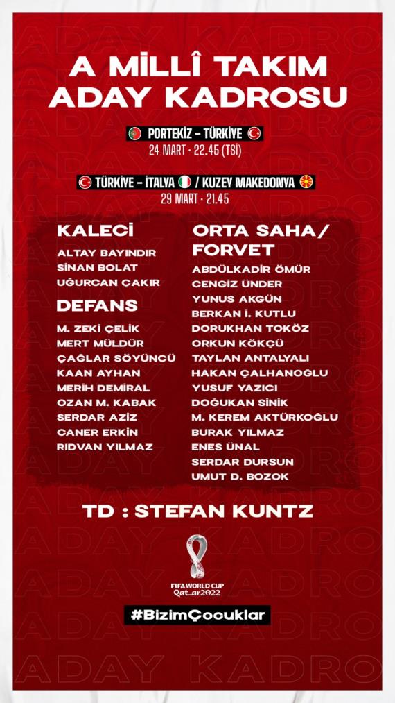 A Millî Takım Teknik Direktörü Stefan Kuntz tarafından belirlenen aday kadroda 27 futbolcu yer aldı.