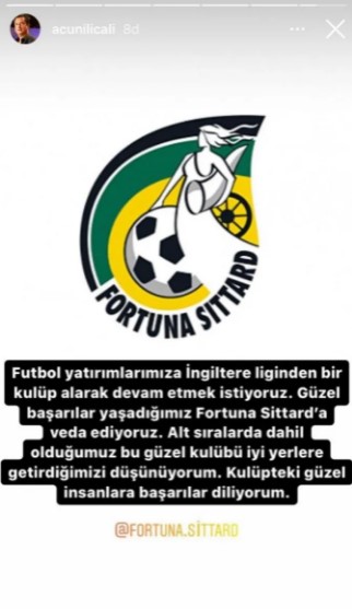 "Futbol yatırımlarımıza İngiltere Ligi'nden bir kulüp alarak devam etmek istiyoruz. Güzel başarılar yaşadığımız Fortuna Sittard'a veda ediyoruz. Alt sıralarda dahil olduğumuz bu güzel kulübü iyi yerlere getirdiğimizi düşünüyorum. Kulüpteki güzel insanlara başarılar diliyorum."