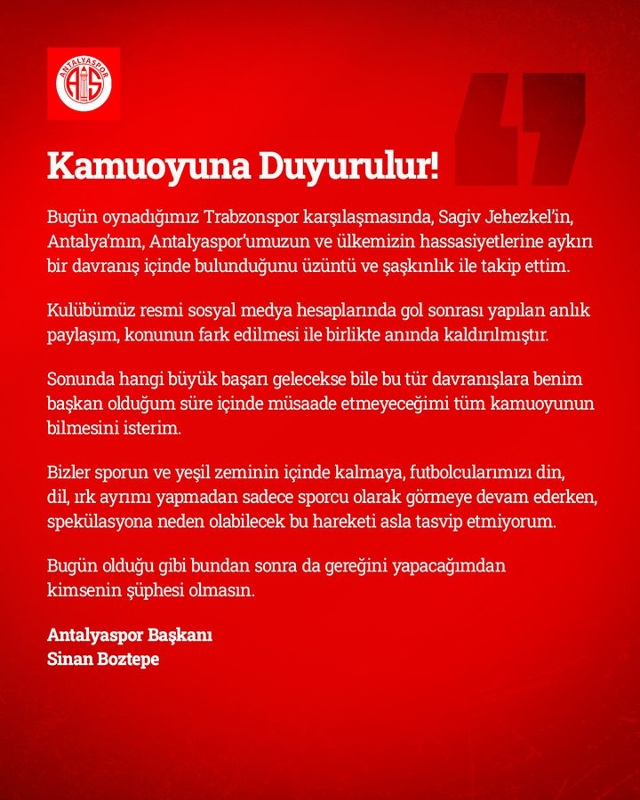 Antalyaspor, Trabzonspor ile oynanan karşılaşmada takımının golünü attıktan sonra gol sevinci yaşarken kolundaki bandajda yazan yazıyı gösteren İsrailli oyuncu Sagiv Jehezkel'in kadro dışı kaldığını açıkladı. Futbolcu daha sonra da gözaltına alındı.