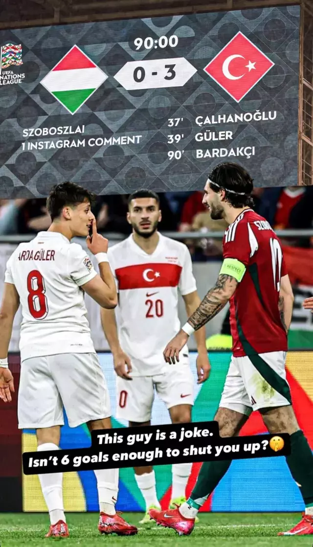 Karşılaşmanın ardından Szoboszlai, Arda'nın “sus” işaretinin yer aldığı bir fotoğrafı paylaşan Macar haber sitesine “1088” yorumunu bıraktı. Bu sayı, Arda Güler’in Real Madrid formasıyla bu sezon aldığı toplam dakika sayısını ifade ediyordu. Szoboszlai bu hamlesiyle Arda’nın forma süresini tiye aldı.